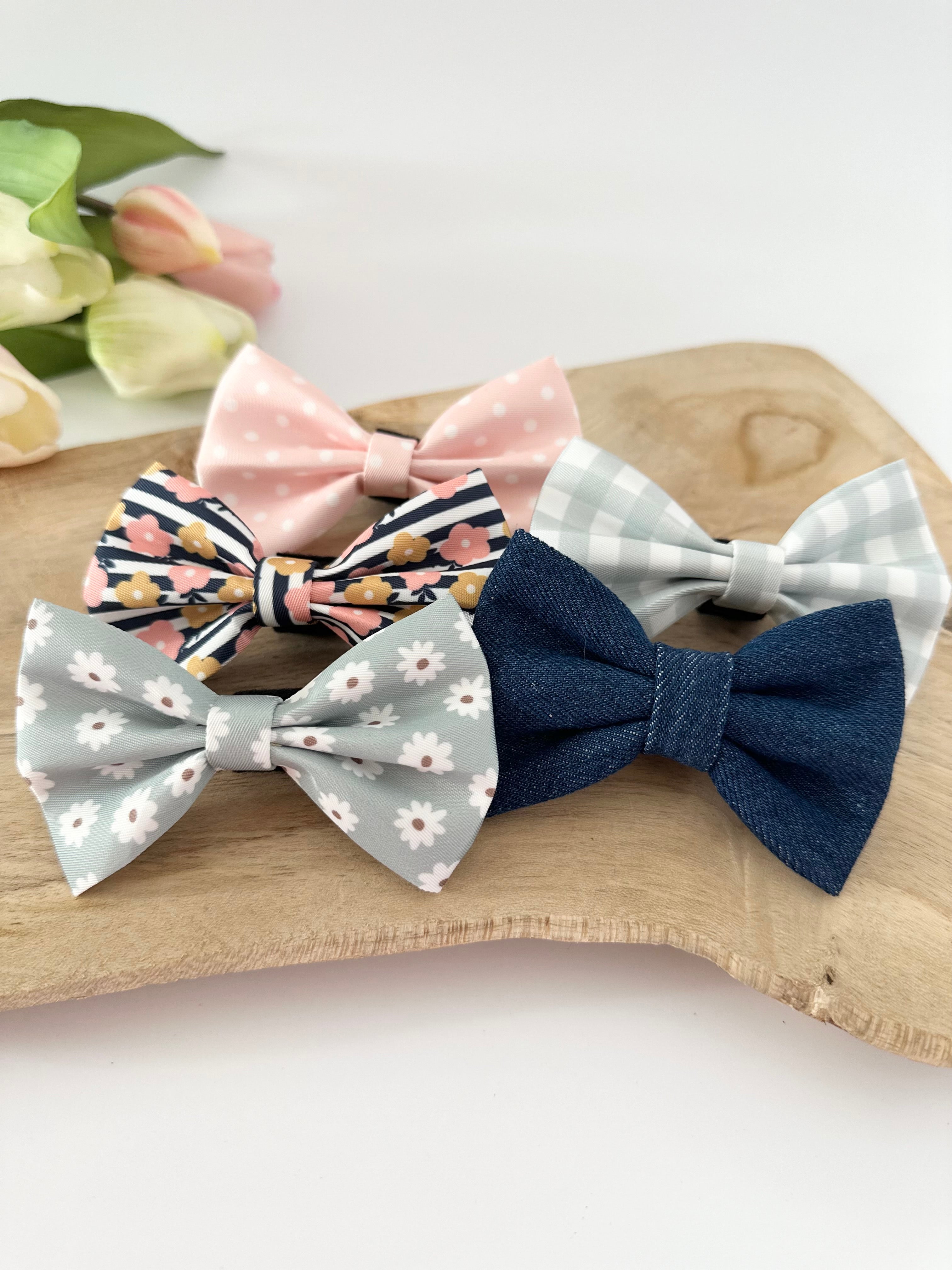 Casual dog bandanas and bows made from beautiful fabrics. A charming eye-catcher.