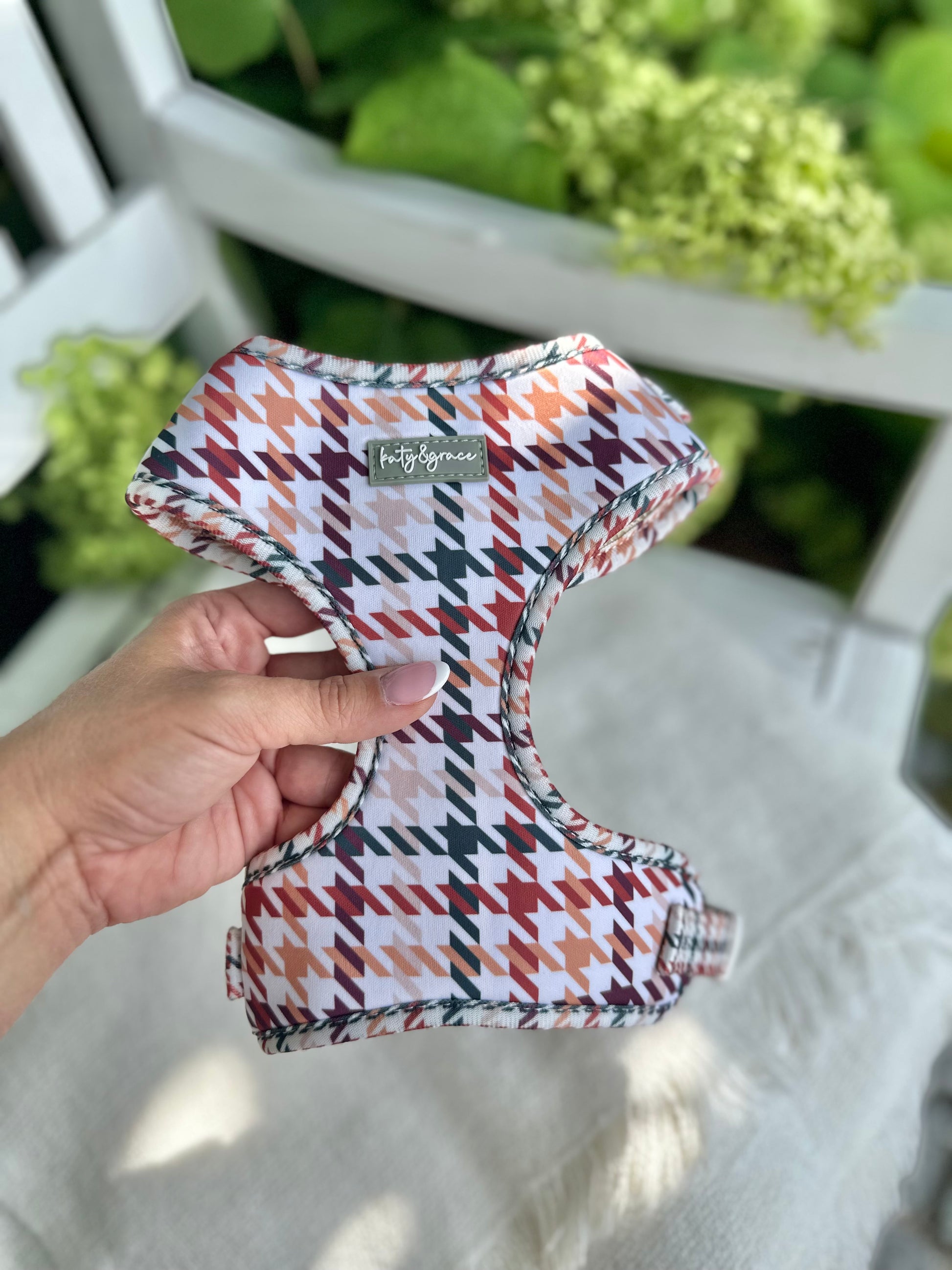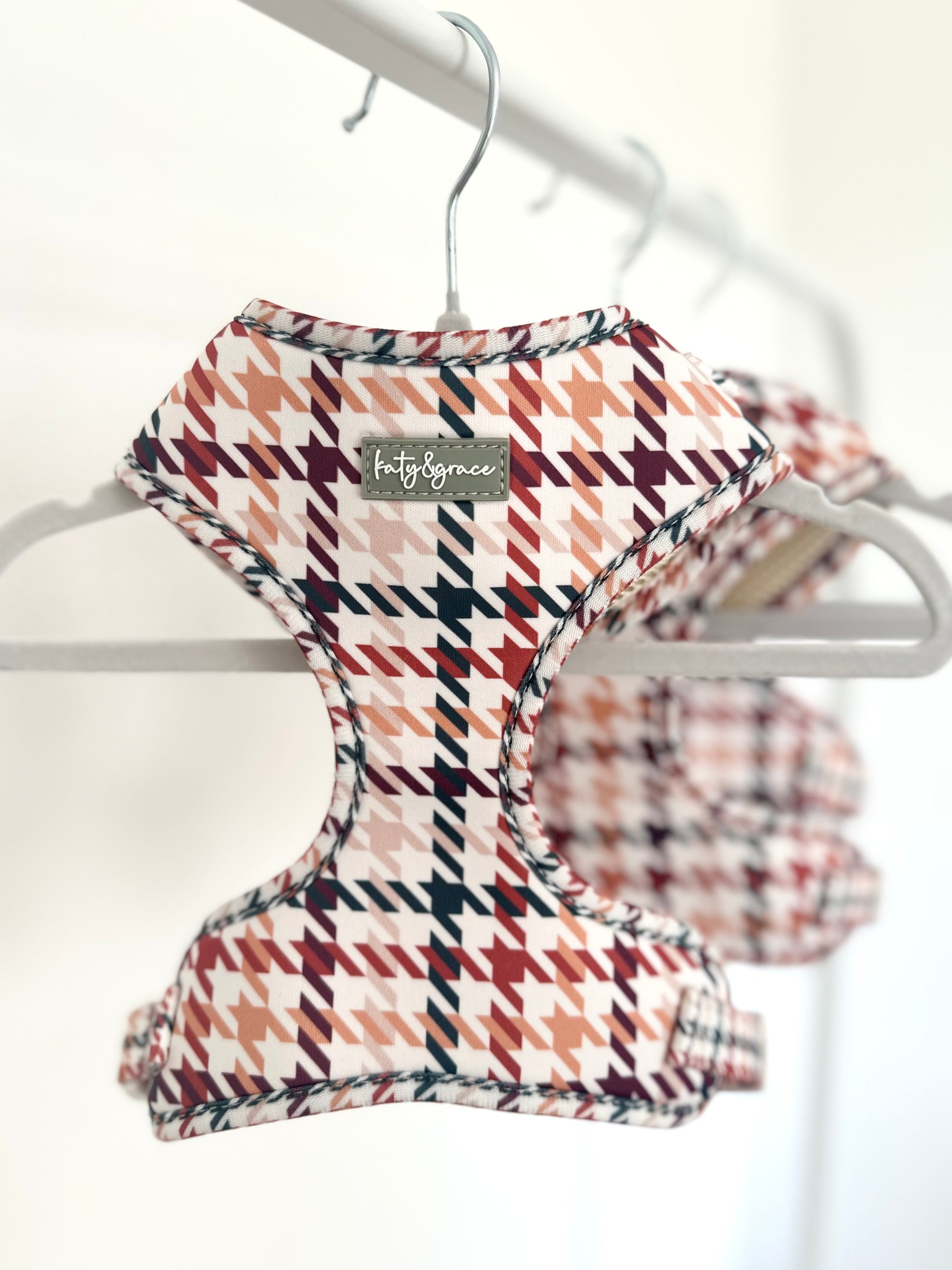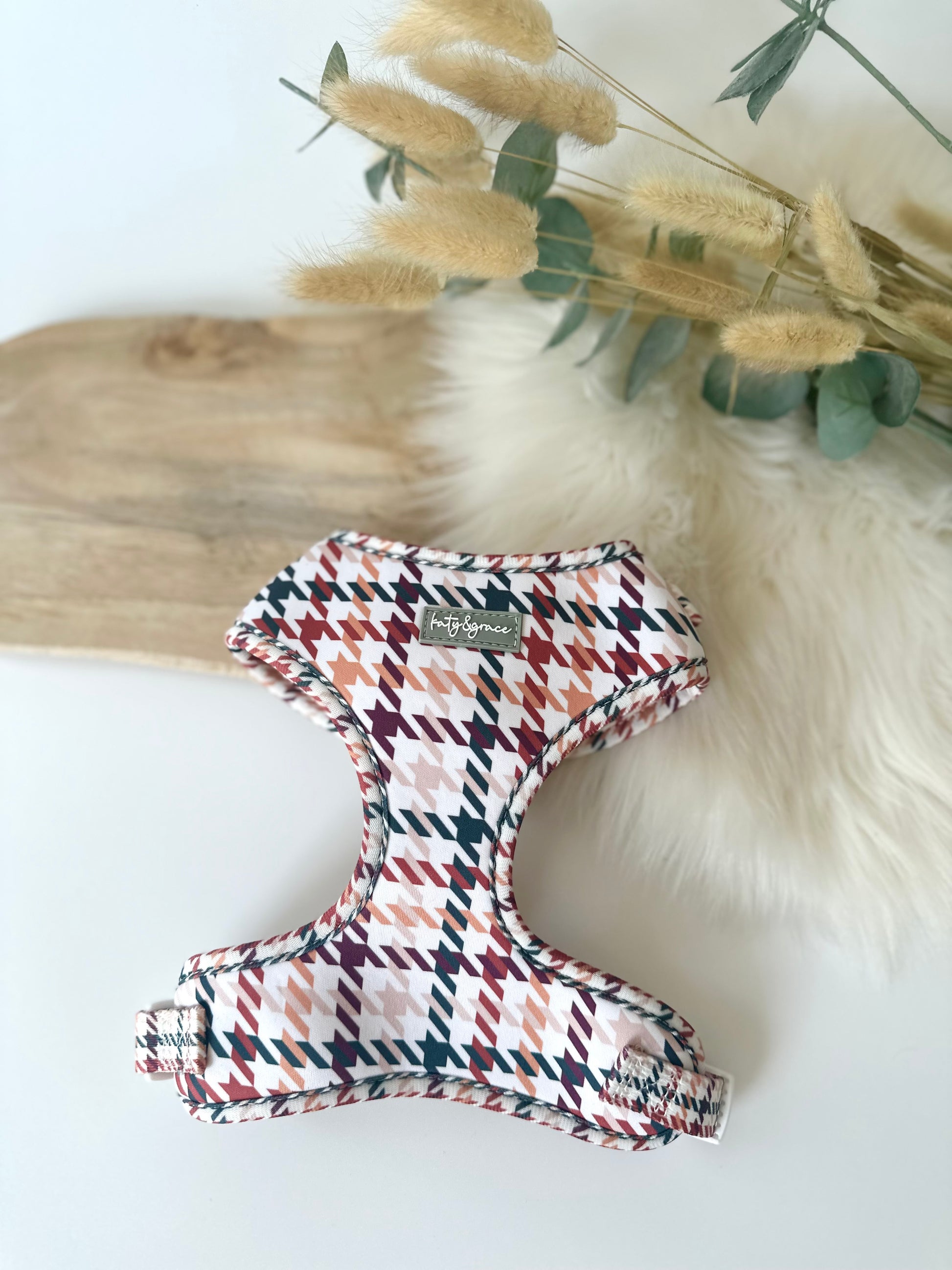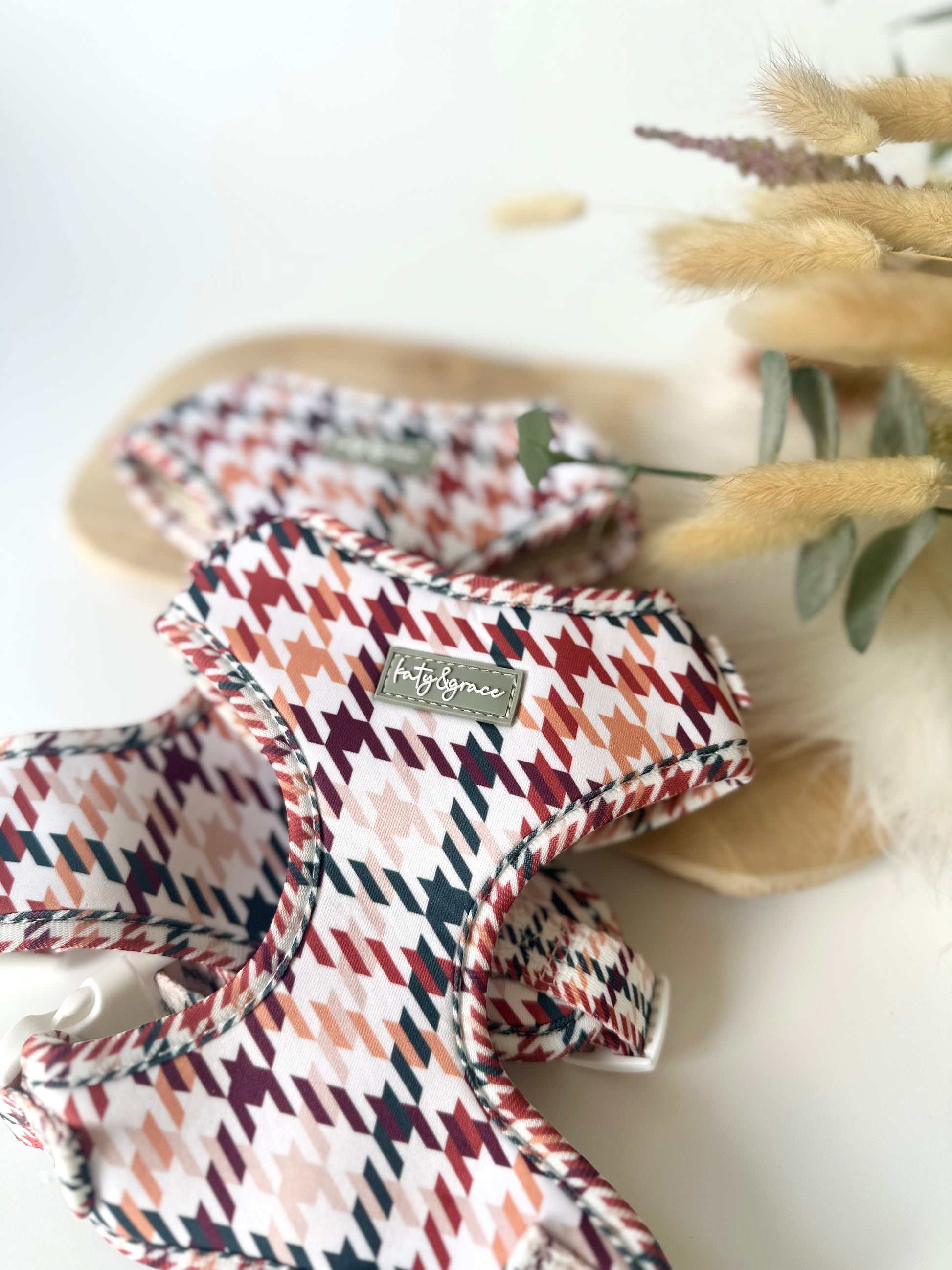 Meet our Classic Hound adjustable harness. A playful twist to the timeless houndstooth pattern, mixing shades of burgundy, burnt orange and deep green.