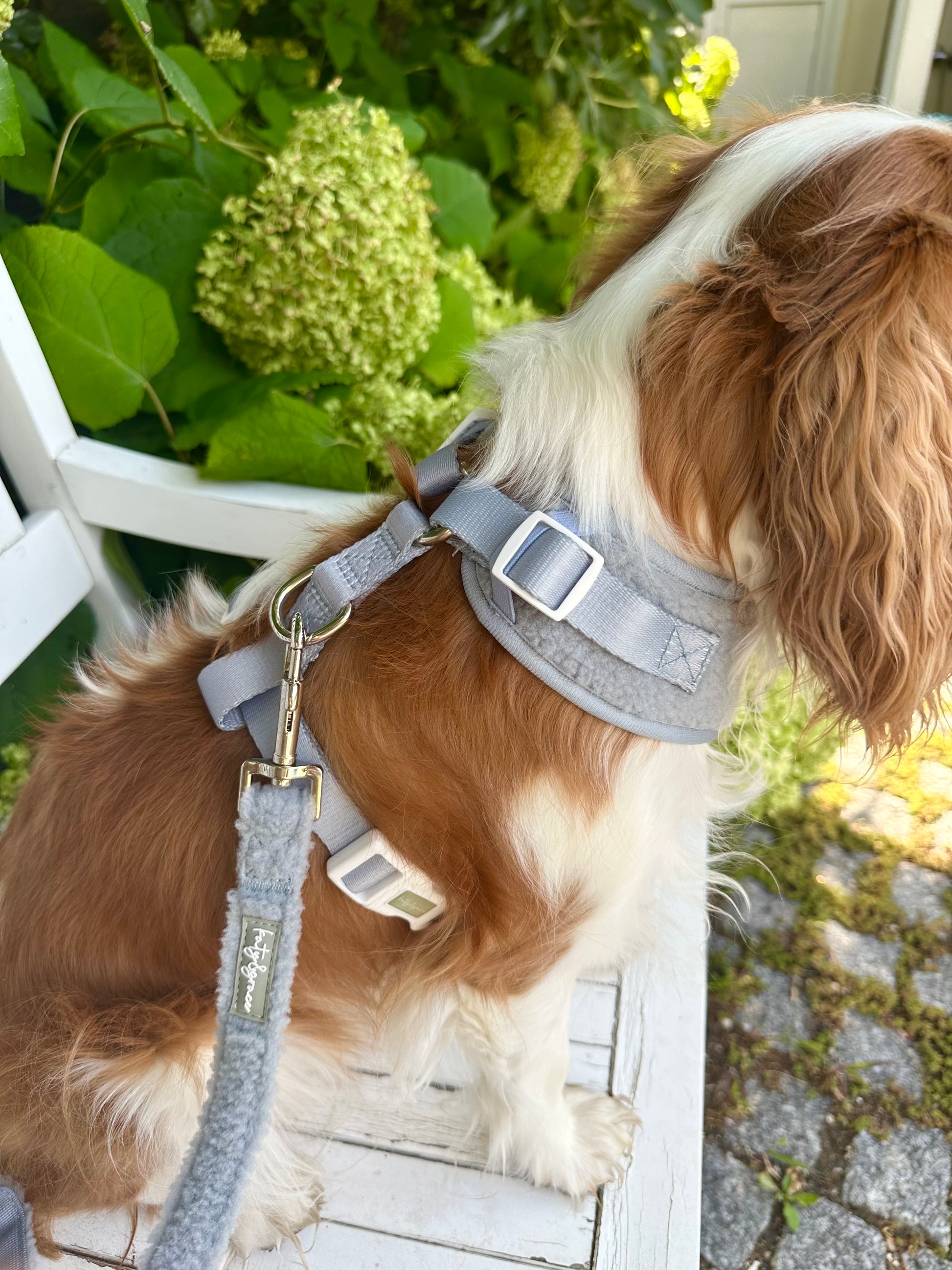 Meet our Cozy Teddy adjustable harness in frosty blue. The cutest teddy fabric paired with light blue lining.