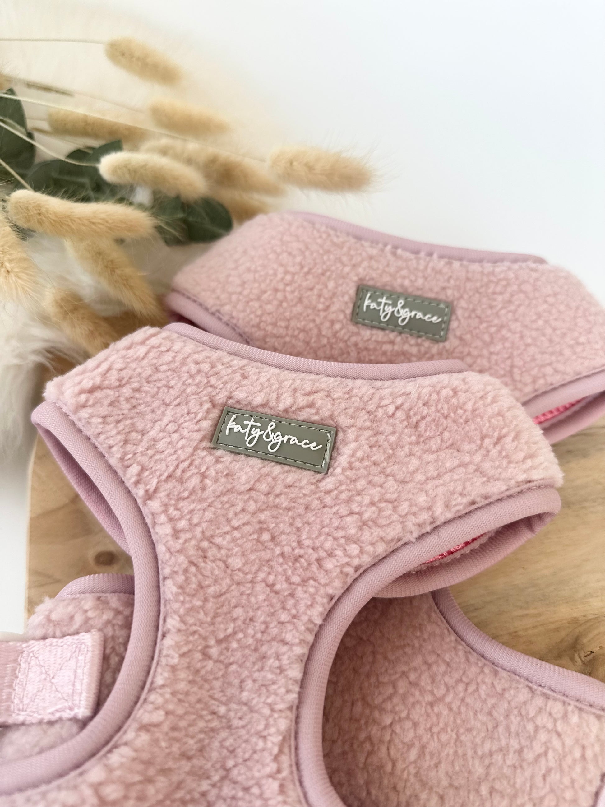 Meet our Cozy Teddy adjustable harness in duty rose. The cutest teddy fabric paired with pink lining.