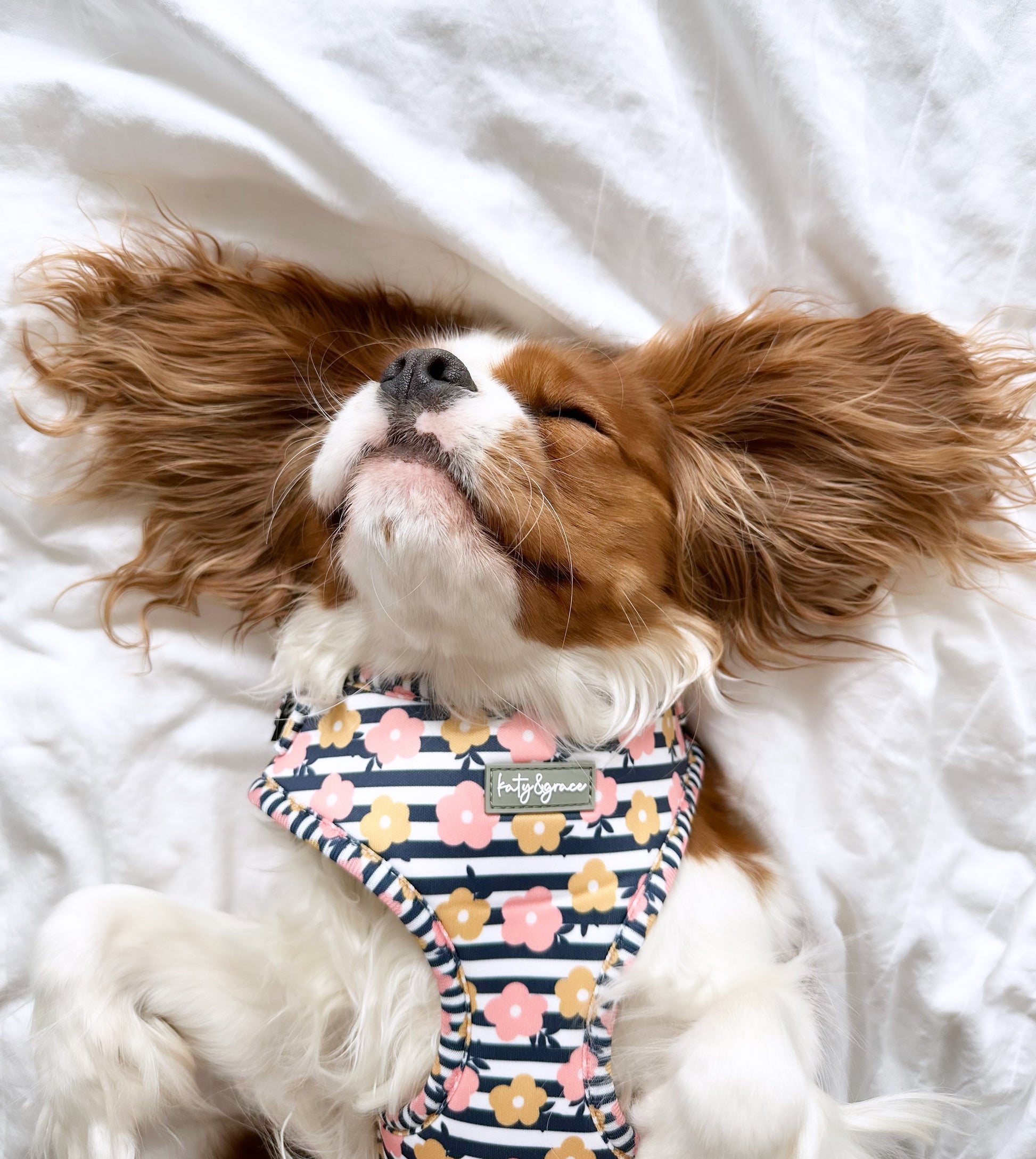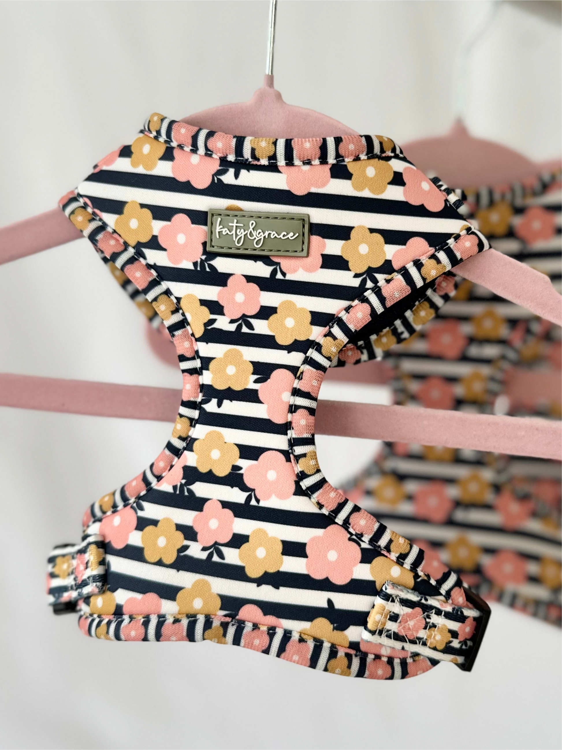Meet our Katy&Grace adjustable harness. A sweet twist on La Marinière with cute little flowers in pink and mustard yellow, paired with navy lining.