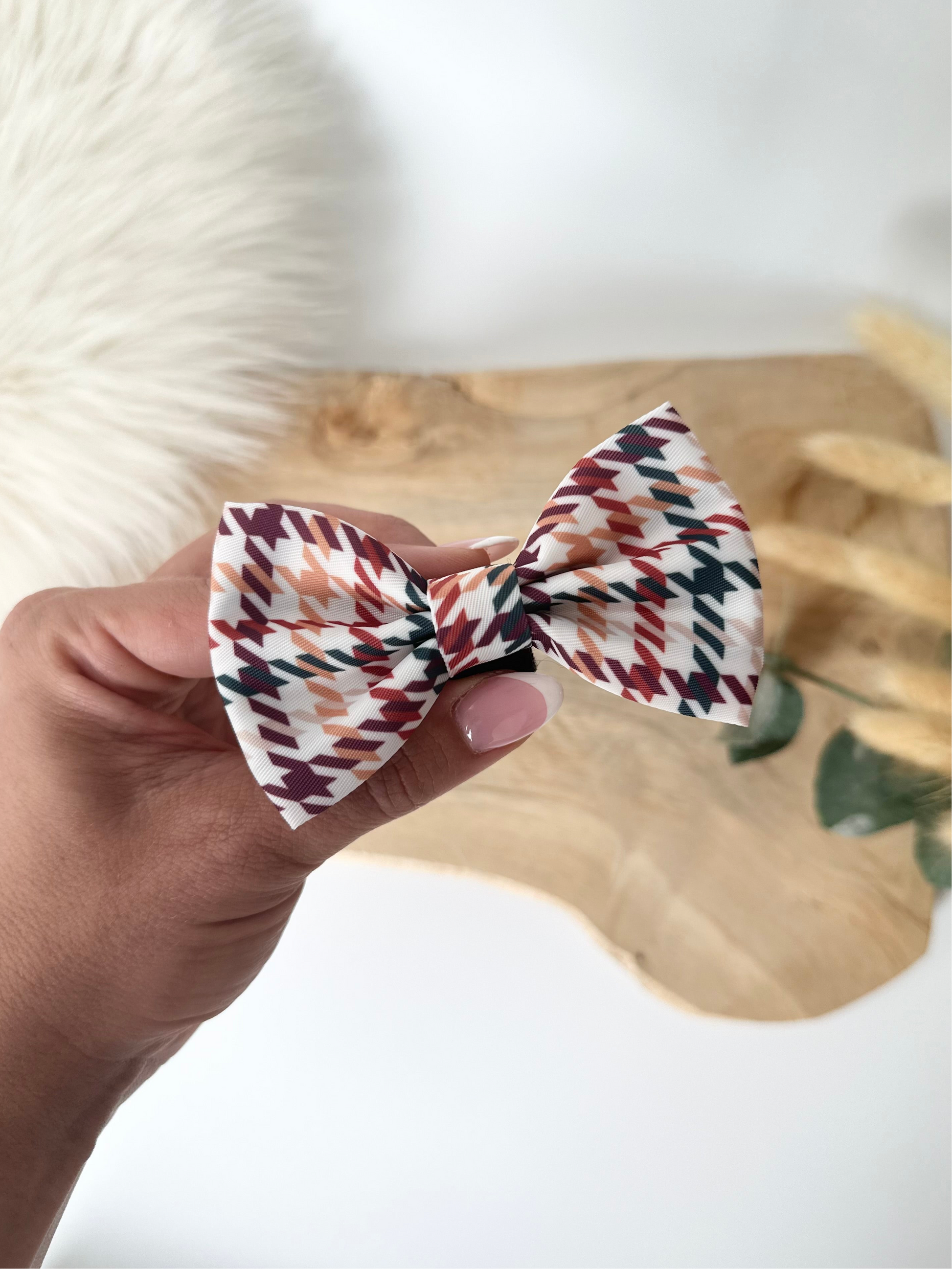 Meet our Classic Hound Bow. A playful twist to the timeless houndstooth pattern, mixing shades of burgundy, burnt orange and deep green.